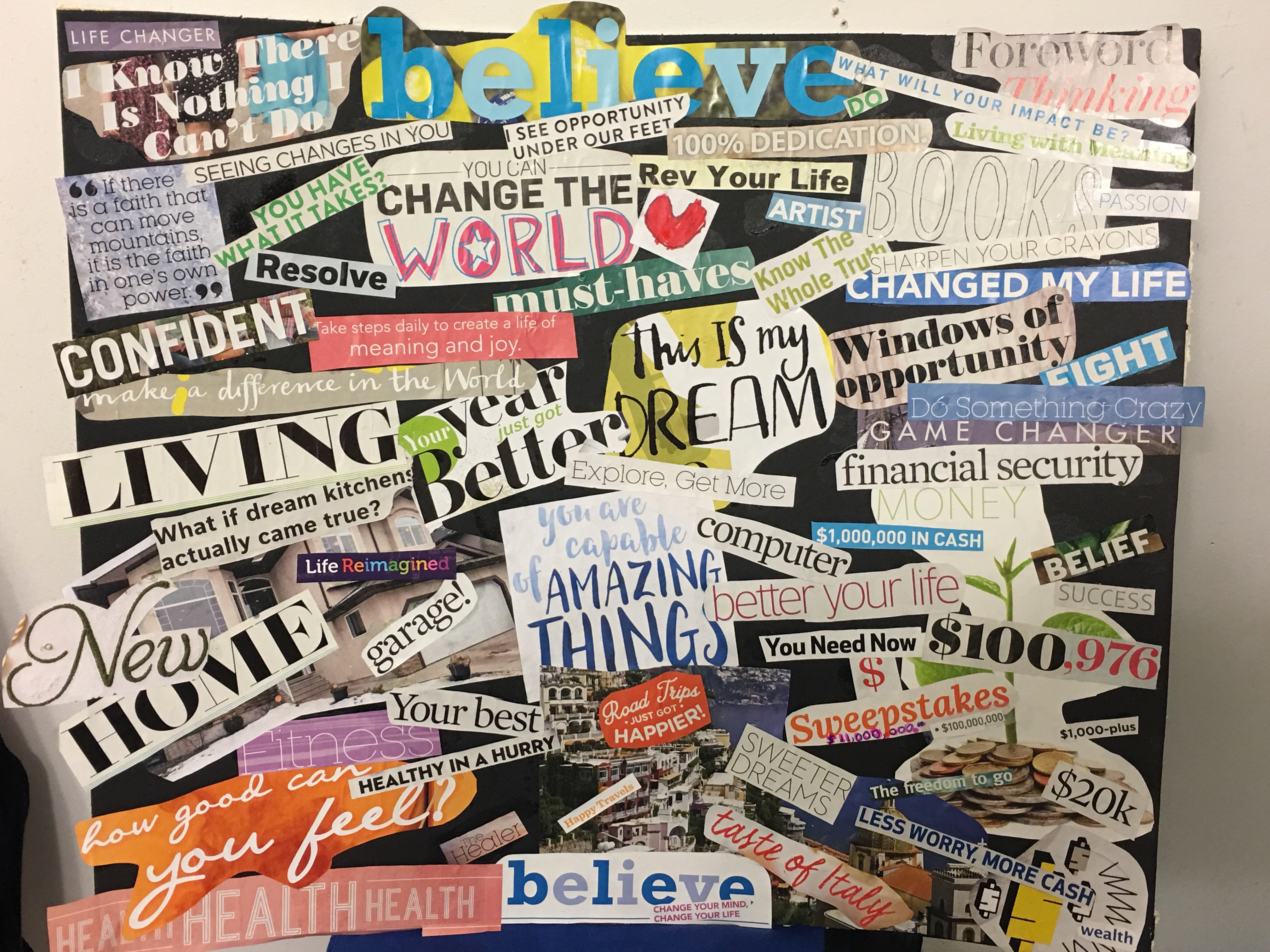I finished my vision board today!! I have been watching videos on YouTube as I’ve been making my vision board and some of the stories are crazy amazing!! There are so many people who are using the Law Of Attraction to manifest positive things into their lives. I’ve been wanting to make a vision board and begin using the Law Of Attraction for myself for some time now. My hubby doesn’t believe in any of this!! He thinks that it’s garbage, because “I’m going to be a realist. If it works it’s just by extreme luck…” So, I feel like I have to use my positive energy to, not only change my personal viewpoint regarding my life, but I have to be extra powerful to overcome his negative and doubting viewpoint. He has not had an easy life and he basically thinks that we’ll never have enough money, we’ll never be able to buy a bigger house, we’ll never travel the world, we’ll never (fill in the blank with a negative thought)!! He pretty much believes that life will always be a struggle and hard. Oh, and he believes that he’s going to die young. He says this ALL the time!! I keep telling him that, if these are his beliefs, this will always be he way it is. If you believe that our thoughts create our world, well things will never shift or change, which will just confirm, to him, that he’s absolutely correct. So, ARGH!!!!! I try to tell him that of course nothing will change if that’s what you believe everything will come to pass. I feel like I have to work not just with God and the universe to bring about what I want to manifest in my life, but I have to believe deep within my heart and soul. I have to visualize like crazy to create the life I want for us. I have double the work, I have to be powerful enough to zap his beliefs and negativity down, while still working with the universe to shift things for us. However, I need things to change and I firmly believe that they can and will! I am writing a book and getting it published. I am going to have enough money for a good life with less of a struggle living cheque to cheque. I am going to get a bigger house (we have SO outgrown our house). I am going to get healthy, body, mind, spirit and soul!! There are many many more things, but these are the big four important things!! Now I’m off to bed!!