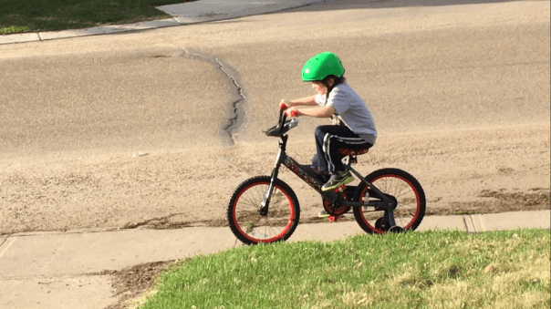My son rode his new bike, wearing his new helmet, that we bought today. We went to the big Canadian Tire in South Common, because my hubby also needed to pick up a new battery for the Miata. The helmet we bought was youth sized, all of the smaller sizes were too tight for him. He has the big Chambers head that I inherited from my dad!! He did really well on his bike, so well that I don’t think he’ll be needing the training wheels for long!! My hubby leaves for Brandon tomorrow, for most of the week. I hate it when he’s gone!! I’m super tired. I’m doing that fall asleep and delete half my post thing!! Goodness I hate that! It takes forever to write and I doze off and half is gone when I open my eyes!! Then I curse and have to start all over again!! What a huge pain in the ass!! I think I’m going to head to bed now. I’ll leave you with this picture of my son on his new bike!!!