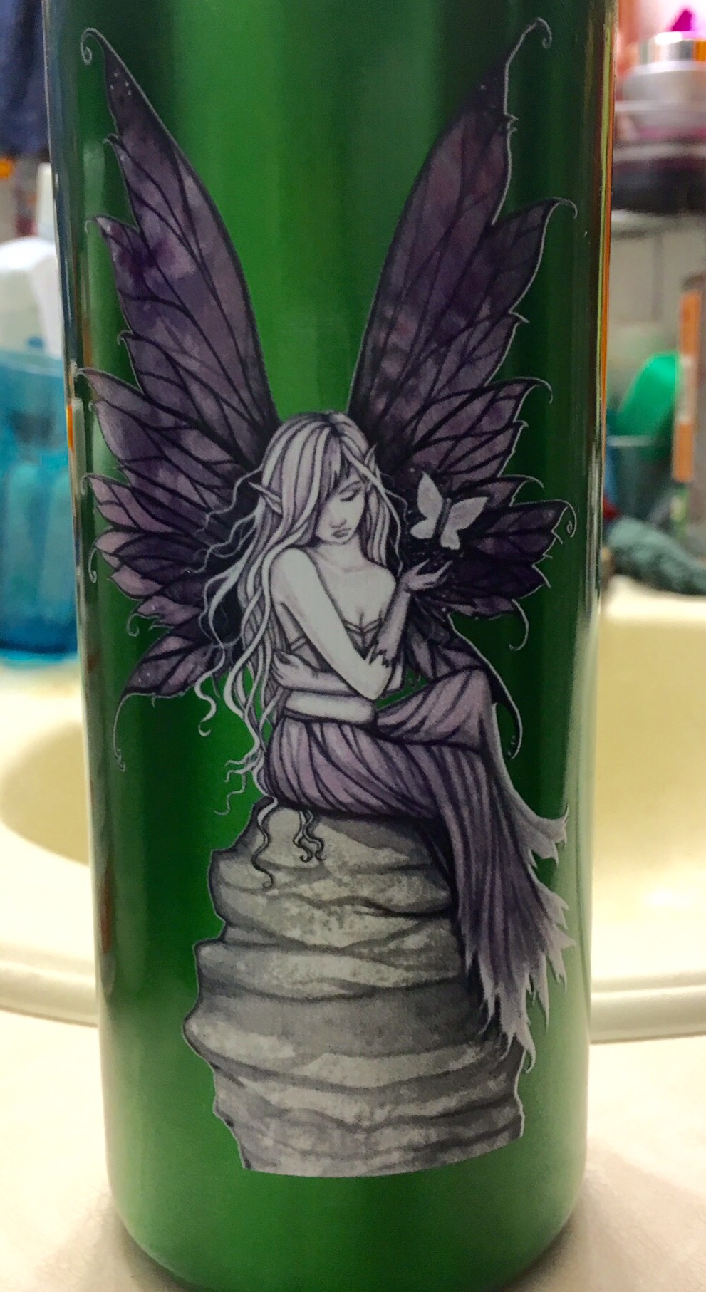 I ordered a new phone case online, with a pretty fairy on it. It arrived today and I was super excited to see it, but they sent me the wrong size. Too frustrating! The first one I ordered, before x-mas was for my iPhone 5s, but we decided to give that phone to our daughter for an x-mas gift. So, yay, I got the new phone and that’s totally awesome (I just don’t get that beautiful case) 😥!! So now my younger daughter’s using that first case I ordered. Then, again, I order a new case and, would you look at that; I have another one that is the wrong size (they told me to keep it or give it away!)!! So my oldest daughter gets one with a different picture of a beautiful fairy…So, yet again, I have to order a new one and pick another image to go on it, because they both, understandingly, don’t want to have matching phone cases with their mom. At least I don’t have to pay for it! And, I got this beautiful waterbottle, with a fairy on it! It came exactly as I ordered…Yay!!