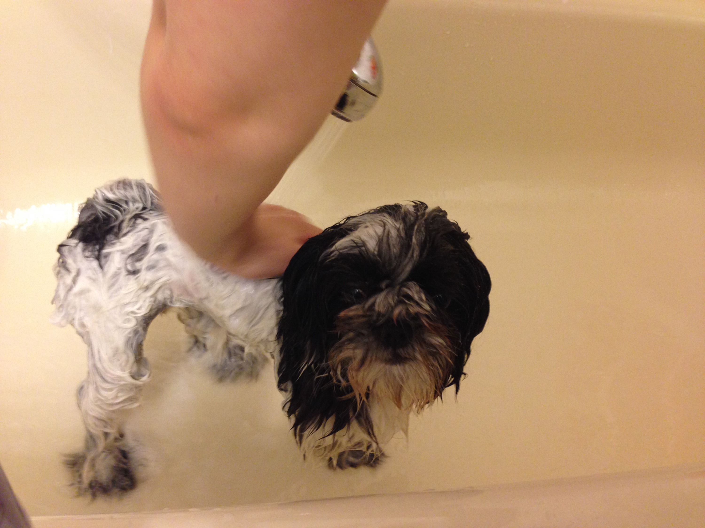 Our poor little girl. She just gets so so scared when she’s in the bath. I’m not sure why. Maybe something happened when she was little…well, she’s still little now, obviously (that’s my daughter’s hand on her back, so you can see how little she is). I just meant before she was found (all alone, in a back alley in down town Edmonton, the size of a grapefruit, all matted and dirty and starving and scared🐶🙍🏼😓). I just wonder if she was thrown into a bath or, even worse, held down in one. (I know, way to jump to the worst case scenario…!) I suspect that something bad happened to her because she gets really scared. Really really scared!!! The first time we gave her a bath, at my mom’s house, she was so so scared, she  practically clawed herself all the way up my daughter, in an attempt to escape. She was crying and shaking and whimpering. The poor little girl. Needless to say, that wasn’t a very long bath!! She had been playing in the sand at the beach that afternoon and she really needed to get cleaned. Especially because she often sleeps on the bed! We did our best, but once we saw how scared she was we didn’t make her to stay in the bath for long. So, she still isn’t a fan of baths (as you can see in the photo) but she’s getting better. She doesn’t cry for the whole time anymore. She still shakes and does a horribly sad, quiet little whimpering, but it’s gotten a bit better. Baby steps, right??